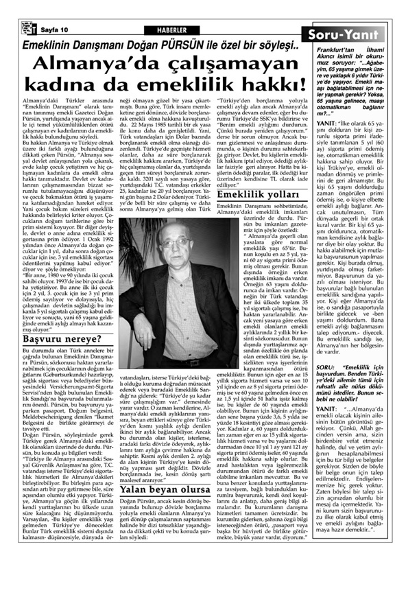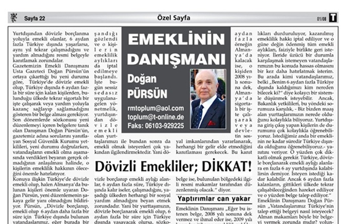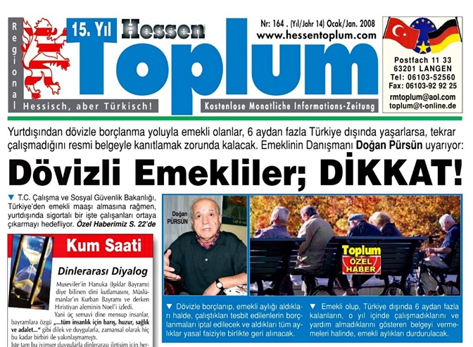Pürsün’ün Hessen Toplum gazetesinde yer alan aydınlatıcı bilgileri, dil bilgisi yetersizliği nedeniyle Alman Emeklilik Sigortası’ndan bilgi alamayan vatandaşlarımız için zengin bir Türkçe bilgi kaynağı/danışma hattı oldu.”