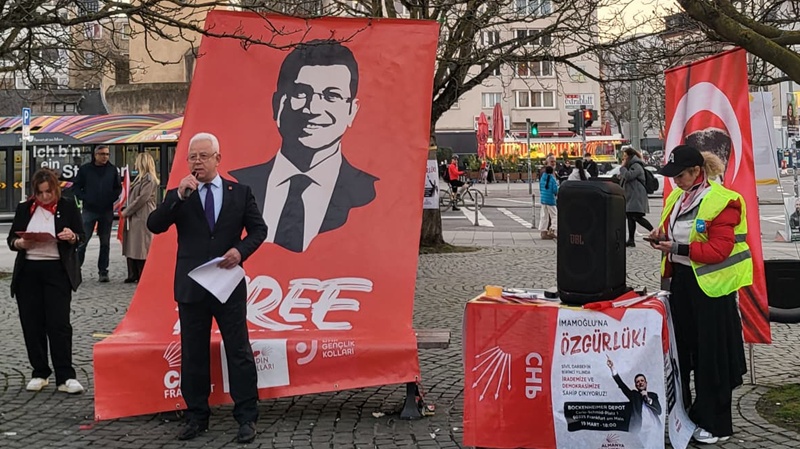 Frankfurt’ta “İmamoğlu’na Özgürlük! Sivil darbenin birinci yılında irademize ve demokrasimize sahip çıkıyoruz!“ çağrısıyla düzenlenen eylemde İmamoğlu’nun ve CHP’nin Yurtdışı Örgütlenmeden Sorumlu Genel Başkan Yardımcısı Nurhayat Altaca Kayışoğlu’nun mesajları da okundu.