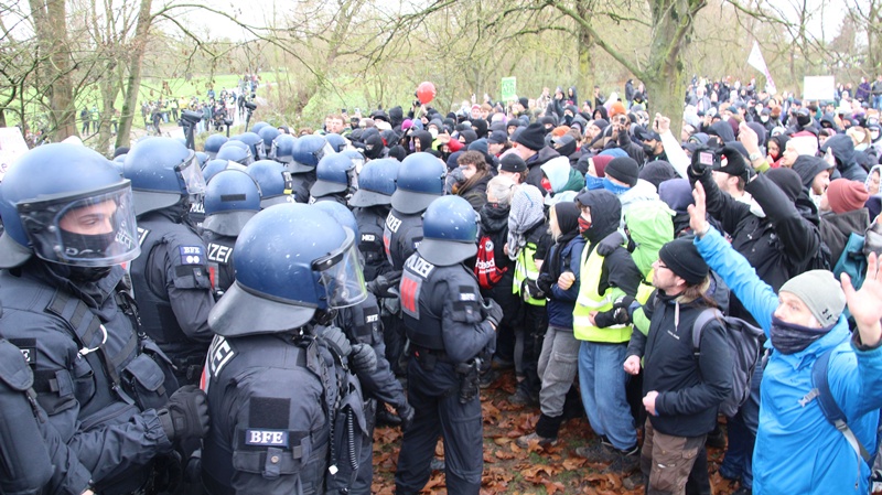 Giessen’de karşıt grupların arasına giren ve fotoğraf çeken aşırı sağcı olduğu iddia edilen üç kişi, protesto ile karşılaşınca polis korumasına alındı. Koruma polislerini ve aşırı sağcıları Lahn nehri kıyısında uzun süre abluka altına alan antifaşistler, bir süre sonra yüzlerce polisin çok sert müdahalesiyle karşılaştı. Pek çok antifaşist, müdahale sırasında yaralandı. Üç kişi polis korumasıyla olay yerinden uzaklaştırılırken ağır darp nedeniyle yaralananlar ise ambülanslarla hastaneye kaldırıldı. Kentte protestolar, mitingler, eylemler muhtelif yerlerde gün boyu sürdü.