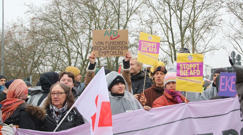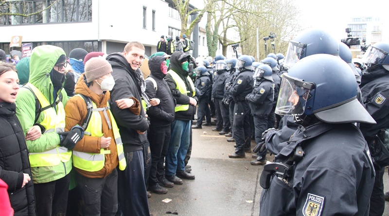 Yaklaşık 80 kentten 200 otobüsle gelerek aşırı sağcıları taşıyan araçları engellemek isteyen anti faşist gruplar, çevre otoyollarda eylemler düzenledi. Engellemeler nedeniyle AfD’nin gençlik organizasyonu “Generation Deutschland” delegeleri ve aşırı sağcı partinin yöneticileri toplantı salonuna gelemedi. Aşırı sağcı yöneticiler ve delegeler polisin güvenlik önlemleri ve eskortuyla salona geç saatlerde ulaştı. Antifaşist grupların engelleme girişimi ise polisin sert müdahalesine sahne oldu. Polis, barikatları aşıp Hessenhalle çevresindeki yeşil alanlarda proteso gösterisi yapan antifaşist gruplara da saldırıp sert şekilde darp etti.