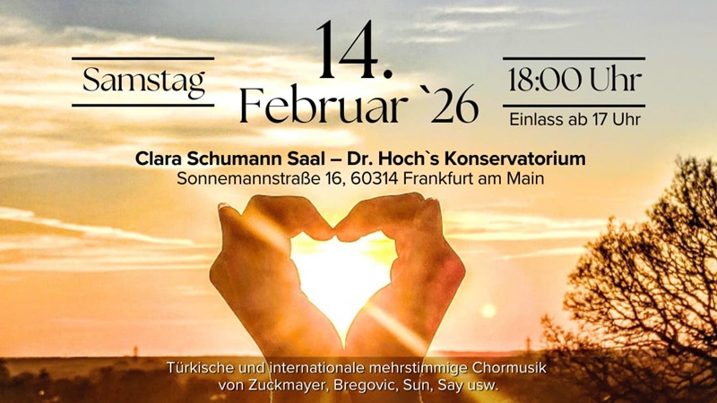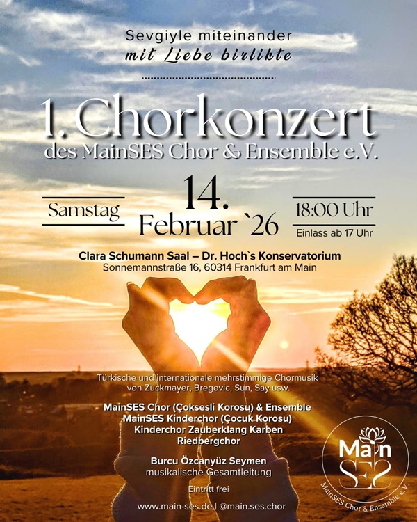 Frankfurt’ta faaliyet gösteren MainSes çok sesli korosu, „Sevgiyle miteinder, mit Liebe birlikte“ adıyla konser gerçekleştirecek. 14 Şubat Cumartesi günü, Clara Schumann Saal, Dr. Hoch’s Konservatorium, Sonnenmannstr. 16, 60314 Frankfurt adresinde düzenlecek konserde MainSes Çok Sesli Korosu, Ensemble, MainSes Çocuk Korosu, Karben Zauberklang Çocuk Korosu ve Riedberg Korosu sahne alacak. Burcu Özcanyüz Seymen yönetimindeki konserde Zuckmayer, Bregovic, Sun, Say’ın da aralarında olduğu usta müzisyenlerin eserleri seslendirilecek. Konsere giriş ücretsiz. Ayrıntılı bilgi main-ses.de adresinden alınabilir.