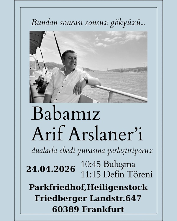 Arslaner Ailesi, Arif Arslaner’in 24 Nisan Cuma günü, Frankfurt ile Bad Vilbel kentleri arasındaki Heiligenstock mezarlığında (Friedberger Str 647, 60389 Frankfurt) toprağa verileceğini duyurdu. Mezarlıkta buluşma saat 10.45, defin ise saat 11.00’de gerçekleşecek (gk)