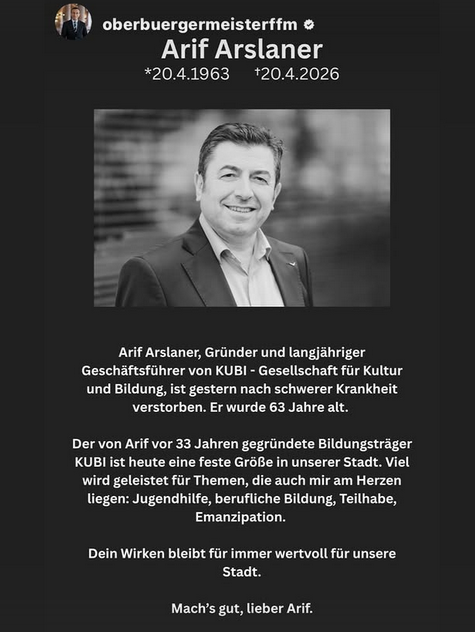 “Türkiye doğumlu Arif Arslaner, 33 yıl önce Frankfurt’ta KUBI Kültür ve Eğitim Derneği’ni kurdu ve yıllar içinde BIKU gGmbH adlı bir yan kuruluşu ve 200’den fazla çalışanı olan tanınmış bir eğitim kurumuna dönüştürdü. Başlangıçta bir göçmen örgütü olarak bilinen, şimdi ise kâr amacı gütmeyen kurum, Frankfurt’ta giderek daha önemli bir kültürlerarası oyuncu haline gelmiş ve belediye, eyalet ve federal yetkililerle yakın işbirliği içinde gençlik ve aile desteği, katılım ve demokrasi için fon projeleri geliştirip uygulamaktadır (…) Frankfurt şehri, 2006 yılında henüz bir dernek olan KUBI’ye şehrin Entegrasyon Ödülü’nü vererek onun başlattığı çalışmaları onurlandırdı. Arslaner, 2021 yılında da eşit katılım ve entegrasyon, demokrasi ve sosyal uyum alanlarındaki onlarca yıllık özverili çalışmaları nedeniyle Frankfurt Şehri Onur Madalyası’nı aldı. Ödül törenindeki konuşmasında ‘Birçok insana eğitim ve entegrasyon fırsatları sağlamak için yorulmadan çalışan tüm personelimize ve ortaklarımıza teşekkür ediyorum. Bu ödül aynı zamanda sizin de ödülünüz!’ demişti. KUBI’nin tam da bu ruhla çalışmalarına devam etmesini amaçlıyoruz. Ancak bugün Arif’in ailesi, eşi ve çocuklarıyla birlikte yas tutuyoruz, onlara ve tüm sevdiklerine çok direnç diliyoruz.”